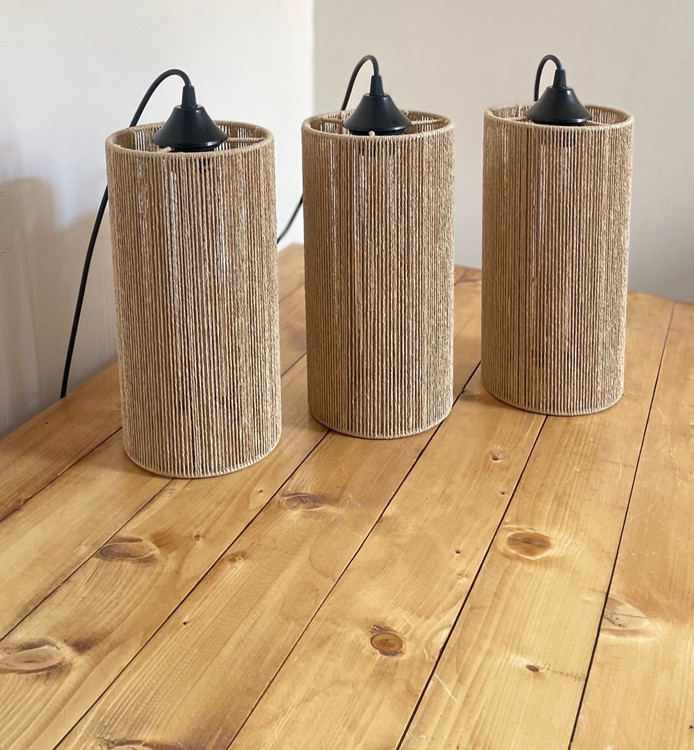 این لوستر دارای سرپیچ طرح ادیسونی و ۸۰ سانتیمتر سیم قابل تنظیم است تا بتوانید ارتفاع نصب آن را مطابق نیاز خود تغییر دهید. طراحی استوانه ای و استفاده از کنف، نور را به شکلی ملایم و دلنشین منتشر میکند و فضایی آرام و صمیمی ایجاد میکند.